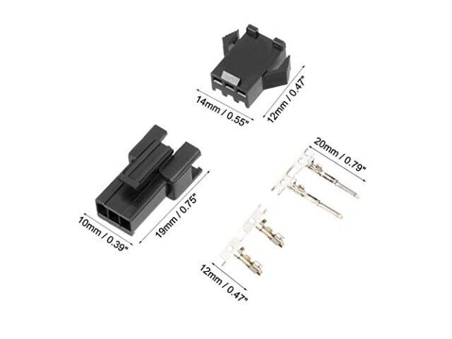 Specyfikacje: Pitch: 2.54mm; Pin Type: 3 Terminals; Male Pin Length: 20mm / 0.79inch; Female Pin Length: 12mm / 0.47inch; Male Housing Size: 14 x 12 x 7mm / 0.55 x 0.47 x 0.28inch (L W H); Wire Female Housing Size: 19 x 10 x 8mm / 0.75 x 0.39 x 0.31inch (L W H)
