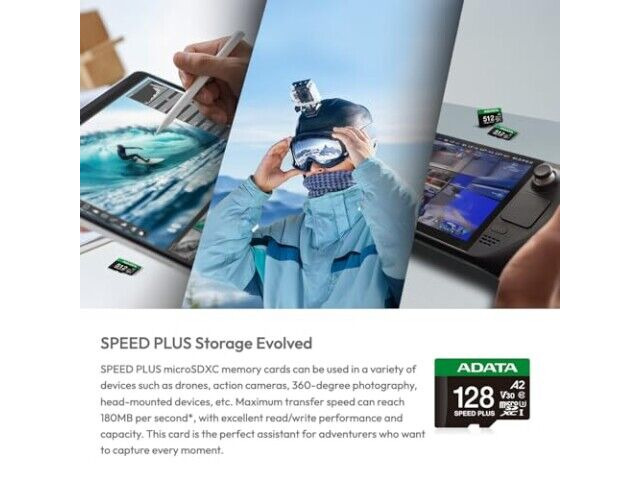 Die ADATA Speed Plus microSDXC-Karte ist mit einer Vielzahl von Geräten kompatibel, darunter Drohnen, Actionkameras, Head-Mounted Displays und 360-Grad-Kameras. Sie ist darauf ausgelegt, den Anforderungen der Aufnahme von Videos in hoher Auflösung und der schnellen Datenübertragung gerecht zu werden. Die Karte wird vorkonfiguriert und sofort einsatzbereit geliefert, ohne dass zusätzliche Software oder Werkzeuge erforderlich sind.