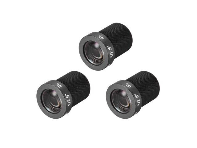 Satsen innehåller tre identiska objektiv, vilket ger flexibilitet för olika kamerapositioner eller säkerhetskopiering. De är konstruerade för att vara hållbara och pålitliga för kontinuerlig användning i övervakningssystem. Den breda vinkeln säkerställer att mer av scenen fångas upp i varje bild, vilket är användbart för övervakning av större områden med färre kameror.