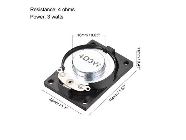 Specifikationer: Effekt: 3 watt; Resistans: 4 ohm; Form: Rund; Material: Metall, Plast, Magnet; Magnetdiameter: 16mm; Fäst hål diameter: 3mm; Fäst hål avstånd: 34 x 23 mm; Total storlek: 40 x 28 x 11 mm