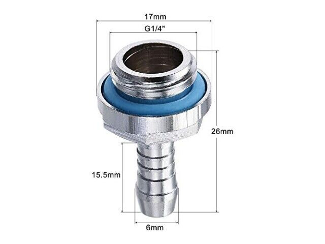 Klämmorna har en G1/4" gängstorlek och en munstyckestörlek på 6mm x 15,5mm, vilket gör dem kompatibla med standardvattenkylningskomponenter. Deras raka form möjliggör enkel installation och justering inom kylningssystemet. Den polerade ytan förbättrar deras utseende och säkerställer en jämn vattenström utan hinder.