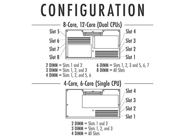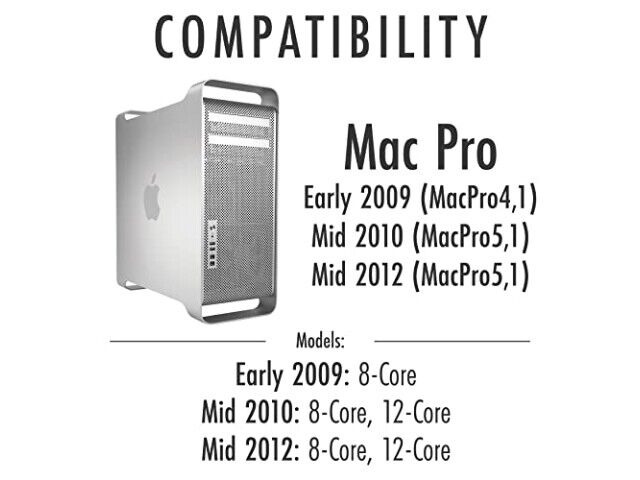 Produkten är kompatibel med flera Mac Pro-modeller, inklusive Tidig 2009, Mellan 2010 och Mellan 2012-varianter med 8-kärniga eller 12-kärniga processorer. Den stöder delnummer som MB535LL/A, MC561LL/A, MD771LL/A och BTO-konfigurationer. Användare bör konsultera sin systems manual för korrekta installationsanvisningar för att säkerställa korrekt installation och optimal prestanda. Paquet innehåller alla nödvändiga komponenter för en enkel uppgradering utan extra tillbehör.