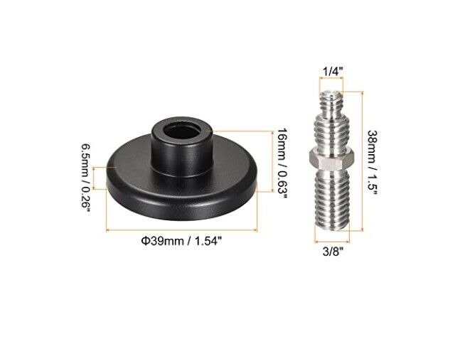 Specifikationer: Gängstorlek: 1/4" Manlig till 3/8" Manlig; Skruvlängd: 38mm/1.5"; Pladlängd: 16mm/0.63"; Huvuddia: 39mm/1.54"; Tjocklek: 6.5mm/0.26"