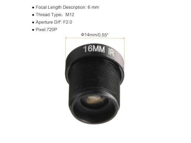 Specifikationer: 16 mm brännvidd, F2.0 bländare, M12 gänga, 720p upplösning