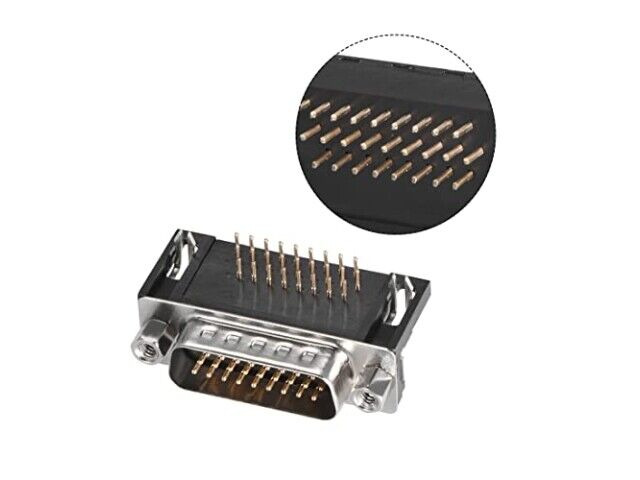 Jest to 26-pinowy złącze D-sub typu męskiego zaprojektowane do sprzętu mechanicznego. Posiada kątowy montaż, co czyni go odpowiednim do zastosowań, w których ograniczona jest przestrzeń. Złącze jest wykonane z materiału kontaktowego w postaci stopu miedzi, zapewniając trwałość i niezawodne połączenia elektryczne. Zostało ono zatwierdzone do maksymalnego prądu 5A, co czyni je odpowiednim do zastosowań o umiarkowanej mocy.