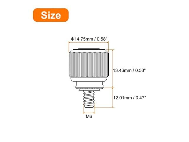 Specifikationer: Gängstorlek: M6; Steglängd: 1 mm; Gänglängd: 12,01 mm; Huvudstorlek: 14,75 x 13,46 mm; Monteringshålsdiameter: 9,53 mm; Minsta paneltjocklek: 0,92 mm