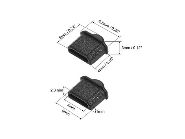 Specifikationer: Passar för kvinnlig port, för bärbar datorport; Material: Silikon; Färg: Svart; Total storlek: 6,5 x 3 x 6 mm / 0,26 x 0,12 x 0,24 tum (L B H); Utsida installera storlek: 6 x 2,3 mm / 0,24 x 0,09 tum (L B); Insida installera storlek: 4 x 1 mm / 0,16 x 0,04 tum (L B); Förpackningsinnehåll: 5st x Silikon Dammskydd