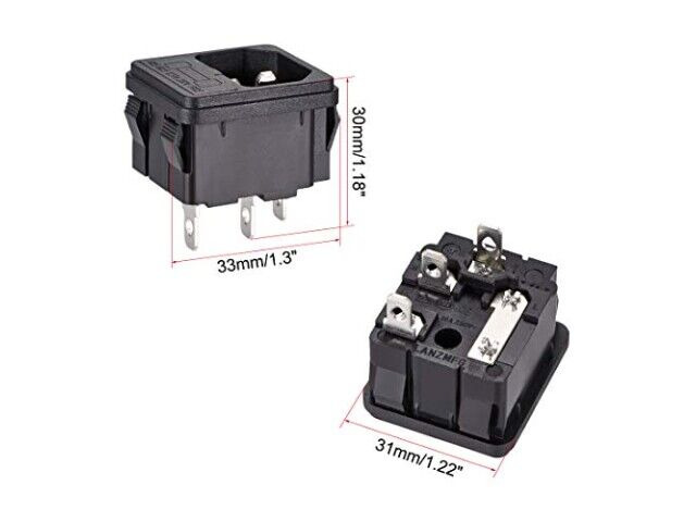 Specyfikacje: Connector Type: C14; Current Rating: 10A; Voltage Rating: AC 250V; Contact Material: Copper; Pin Orientation: Straight; Overall Size: 33x31x30mm/1.3x1.22x1.18inch