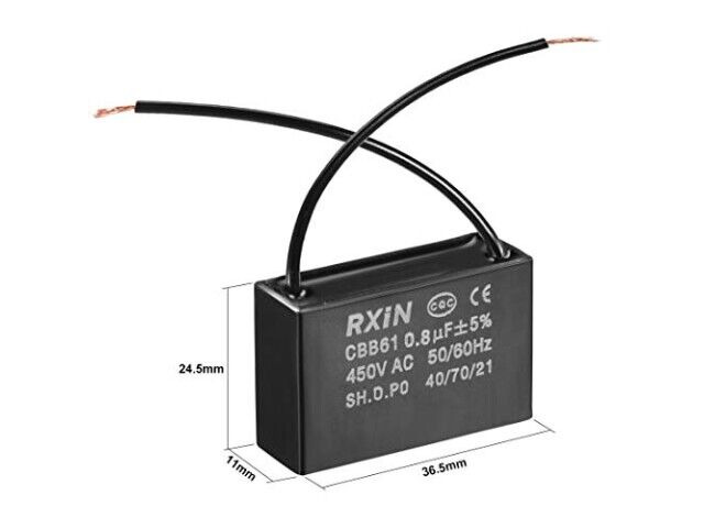 Kondensator ten jest wykonany z metalizowanej folii polipropylenowej z obudową plastikową, co zapewnia takie zalety jak niskie straty, doskonałe właściwości samoleczenia i długą żywotność. Ma znamionową pojemność 0,8 mikrofaradów z tolerancją ±5% i może pracować z napięciem do 450V AC. Wymiary kondensatora to 36,5x11x24,5mm, co czyni go odpowiednim do stosowania w ciasnych przestrzeniach obudów silników. Działa wydajnie w zakresie temperatur od 40°C do 70°C i 21°C.