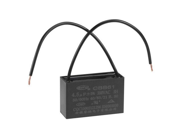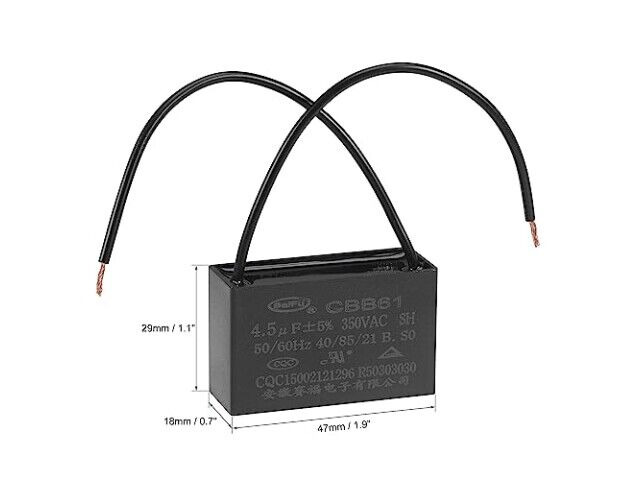 Produkten medföljer med två kablar för enkel installation. Användare bör kontrollera denna kondensator först om deras fläkt eller motor går långsamt eller inte alls, eftersom det kan vara orsaken till problemet. Att byta ut en bränd eller svag kondensator med en ny kan återställa enhetens funktionalitet och prestanda.
