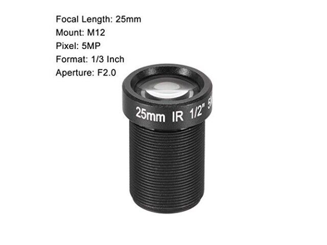 Specificaties: brandpuntsafstand van 25mm, diafragma F2.0, resolutie 5MP, sensormaat van 1/2 inch, bevestiging M12 0.5mm