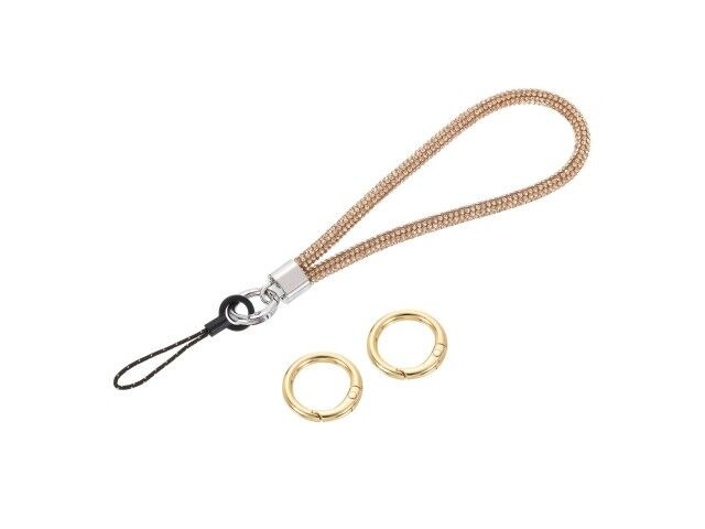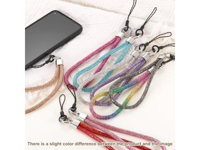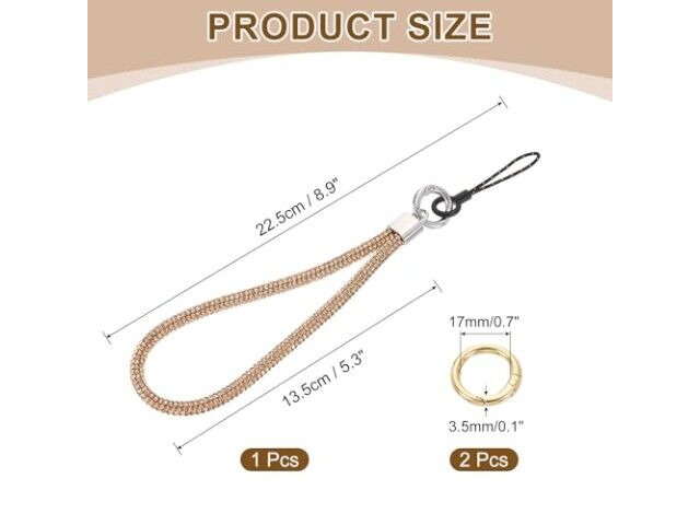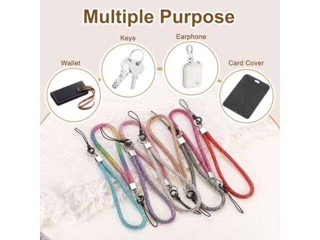 Funkcje: Durable polyester material, rhinestone embellishments, secure spring ring attachment, hands-free convenience, versatile use for phones, keys, and accessories