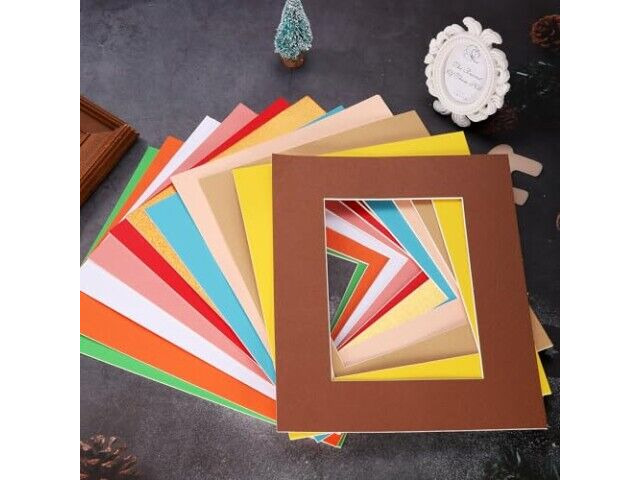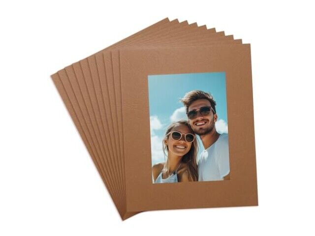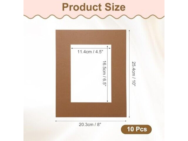 Specyfikacja: Materiał: Karton; Kolor: Brązowy ciemny; Całkowite wymiary: 20,3 x 25,4 cm / 8" x 10"; Wymiary wycięcia: 11,4 x 16,5 cm / 4,5" x 6,5"(L W); Dopasowane wymiary zdjęcia: 5" x 7"; Zawartość opakowania: 10 Pcs x Picture Mats