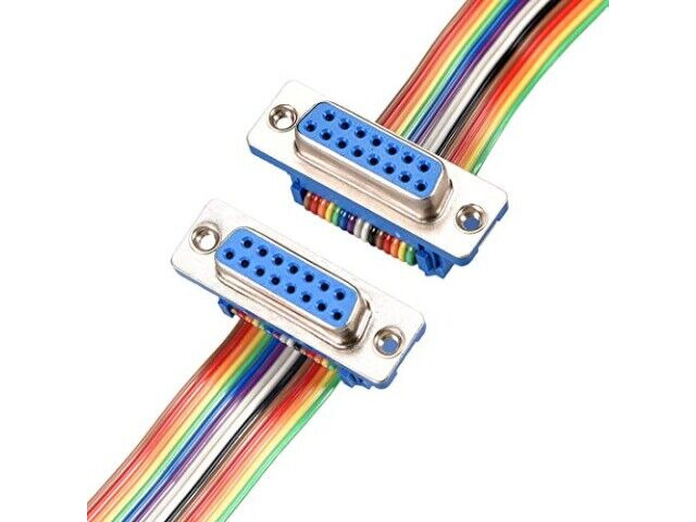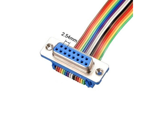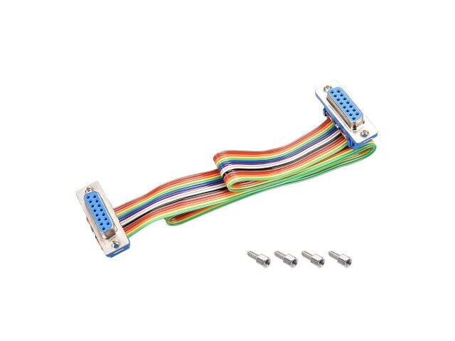 Detta är en platt ribbonskabel som är utformad för internanslutning i elektroniska enheter. Den har en DB15 female till DB15 female-kontaktkonfiguration, vilket gör den lämplig för anslutning av komponenter som kräver denna specifika gränssnitt. Kablen har 15 stift med en 2.54mm stegstorlek, vilket säkerställer kompatibilitet med standardkontakter. Dess regnbågsfärgade kodning hjälper till att identifiera enskilda signalledningar under installationen, vilket är särskilt användbart i komplexa uppsättningar.