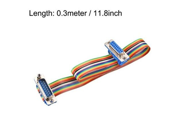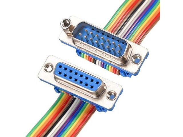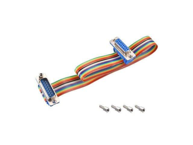Denna är en platt slingskabel utformad för internanslutning i kontorsutrustning, ljud- och videoutrustning och andra elektroniska enheter som kräver en säker och platsbesparande anslutning. Den har en DB15 hona till DB15 hona-kontakt, vilket gör den idealisk för att ansluta komponenter som använder denna typ av gränssnitt. Kablen är utrustad med monterings skruvar för att säkerställa en solid och stabil anslutning när den är installerad. Dess regnbågsfärgade kodning hjälper till att identifiera enskilda signalledningar, vilket är särskilt användbart vid installation eller felsökning.