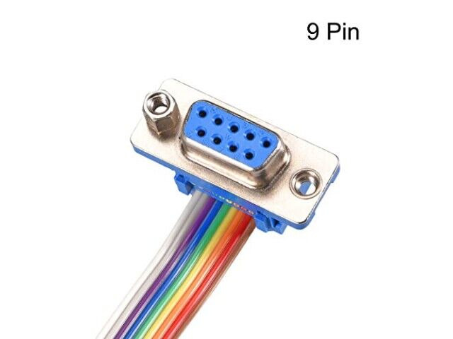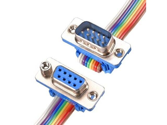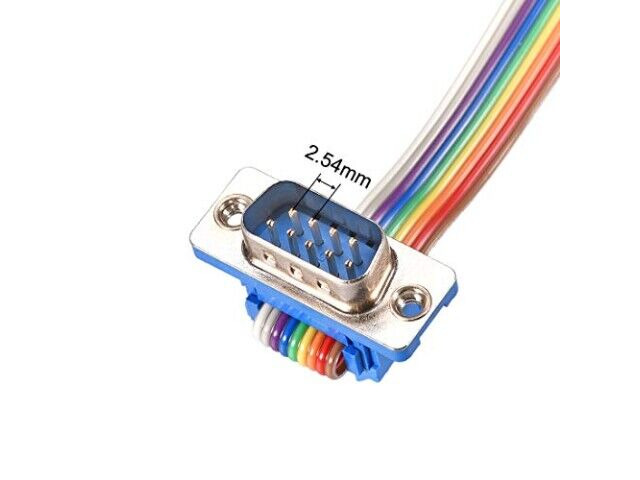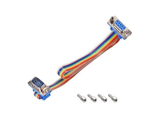 Detta är en platt ribbonkabel utformad för att ansluta DB9 hane till DB9 hon-kontakter. Den har en 2.54 mm stiftintervall och en regnbågsfärgad kabelarrangemang för enkel identifiering av varje stift. Kablar är 11.8 tum lång och är idealisk för internanslutning i enheter som kontorsutrustning och audio-video system. Designt tillåter en säker anslutning med skruvar, vilket säkerställer stabilitet under användning.