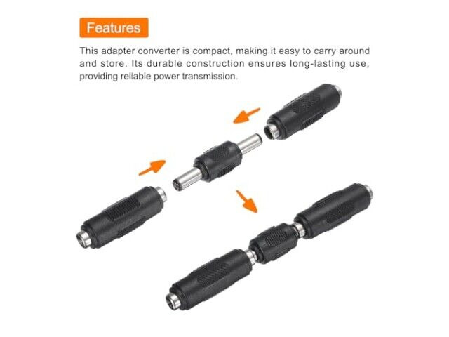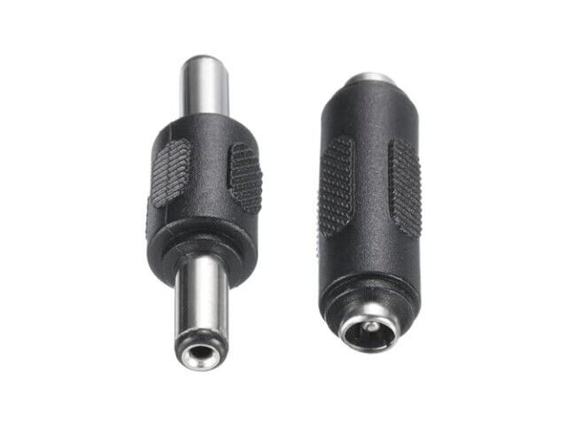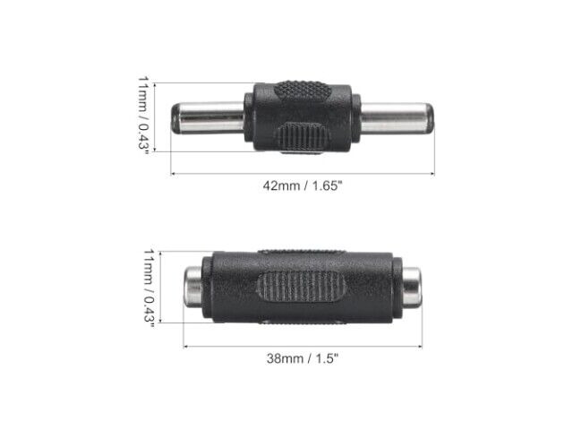 Złącza żeńskie-żeńskie mają wymiary 38 x 11 mm, a złącza męskie-męskie są nieco większe, 42 x 11 mm. Oba typy pasują do standardowego rozmiaru DC 5.5 x 2.1 mm, zapewniając kompatybilność z wieloma urządzeniami. Złącza wykonane są z połączenia metalu i plastiku, co zapewnia równowagę przewodnictwa i trwałości. Użytkownicy powinni sprawdzić specyfikacje swojego urządzenia, aby upewnić się, że pasuje do niego odpowiednio i działa poprawnie.