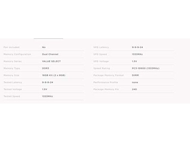Specifications: DDR3 1333 MHz, 16GB (2x8GB), 1.5V, CAS latency 9-9-9-24