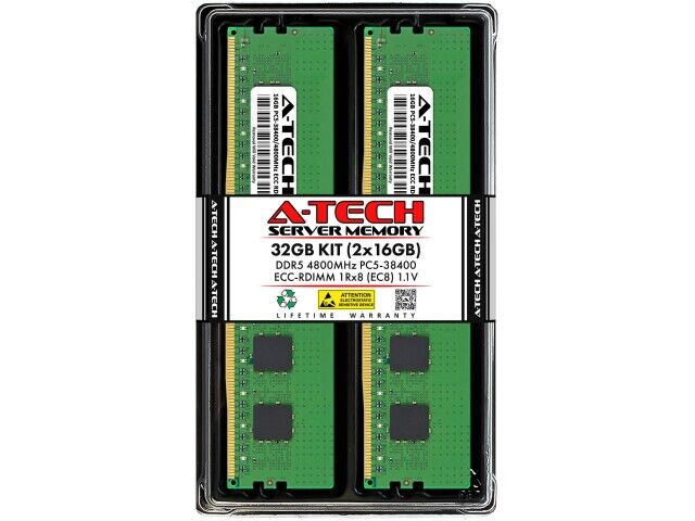 Specifikationer: DDR5 4800MHz, 32GB (2x16GB), 288-Pin, ECC Registered RDIMM, 1Rx8 (EC8 10x4), Single Rank, 1.1V