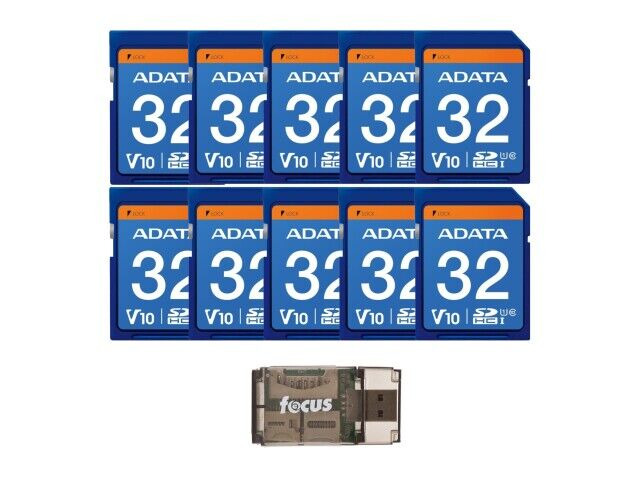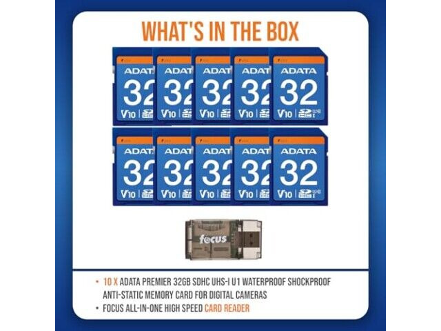 Das Bundle enthält ein Set von 10 ADATA Premier 32GB SDHC UHS-I U1 Speicherkarten und einen Focus All-in-One High Speed Card Reader. Diese Speicherkarten sind für Digitalkameras konzipiert und bieten erhöhte Langlebigkeit mit Funktionen wie wasserdichte, stoßfeste und elektrostatische Schutz. Der Kartenleser bietet eine bequeme Möglichkeit, Daten von den Speicherkarten auf einen Computer oder andere Geräte zu übertragen. Diese Kombination ist ideal für Fotografen und Videografen, die zuverlässige Speichermöglichkeiten und schnelle Datenübertragungsgeschwindigkeiten benötigen.