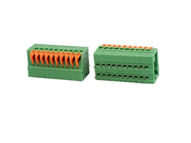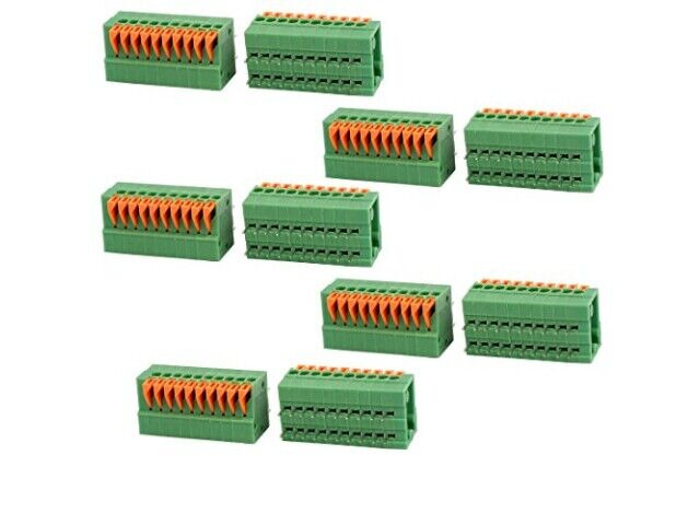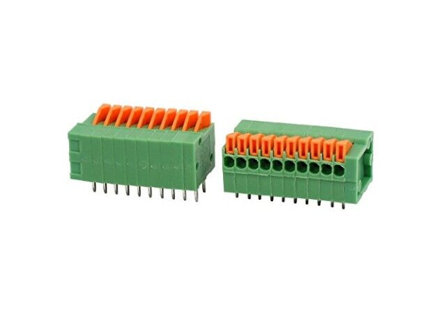 Blok zaciskowy KF141R firmy uxcell to zielony, 10-pozycyjny złączka sprężynowa zaprojektowany do montażu na płytce drukowanej. Oferuje bezpieczne i niezawodne połączenie dla szerokiego zakresu zastosowań elektronicznych. Mechanizm sprężynowy umożliwia łatwe instalowanie i demontowanie przewodów bez potrzeby lutowania. Umożliwia to jego stosowanie w urządzeniach wymagających częstego konserwacji lub modyfikacji.