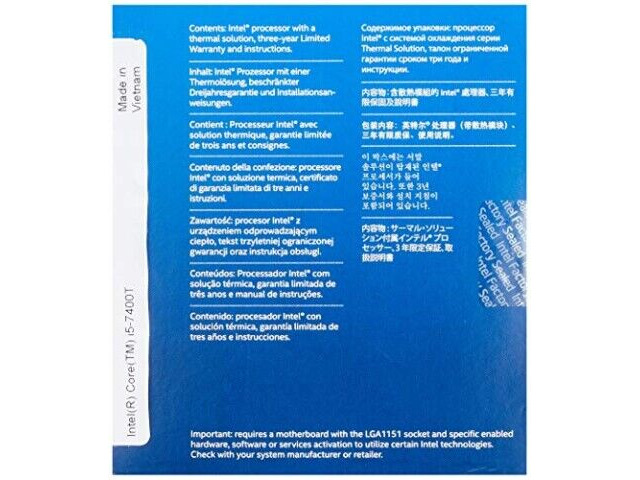 Specificaties: 7e generatie Intel Core i5-7400T, Quad Core, 6MB Cache, 2,4 GHz basisklokfrequentie, 3,0 GHz turbo snelheid, DDR4-2133/2400, DDR3L-1333/1600 @ 1,35 V, FC-LGA14C