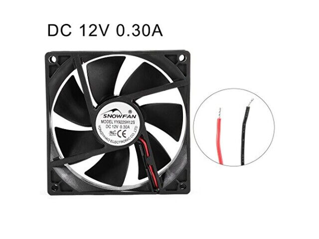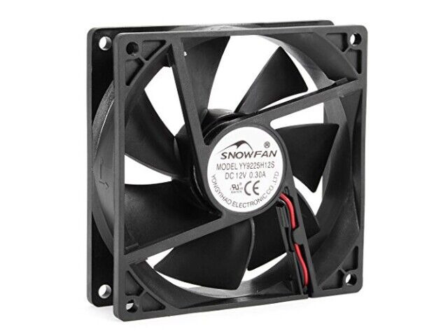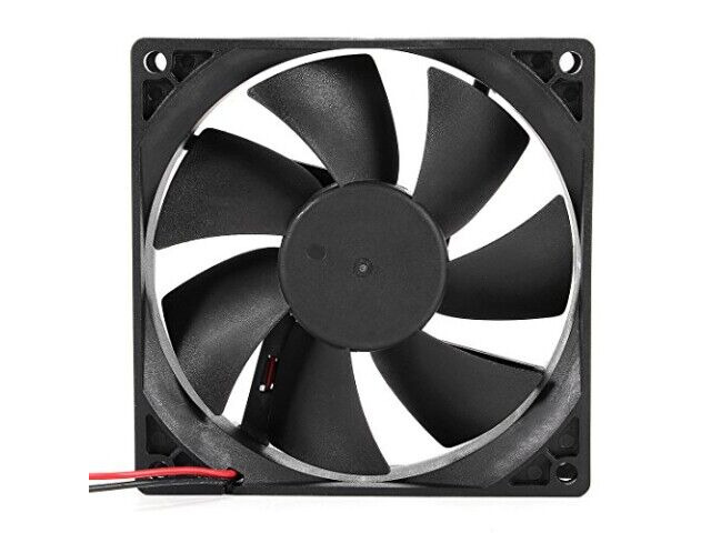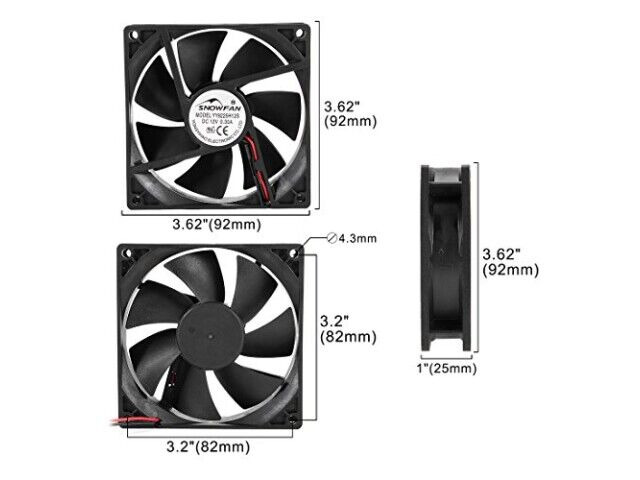Specyfikacje: Dimension: 92 92 25 mm (3.6 3.6 1 inches); Voltage: DC 12V; Current: 0.3A (+ / - 10%); Input (Watt): 1.68W; Speed (R.P.M.): 2300 R.P.M. (+ / - 10%); Air Flow (CFM): 41.5 CFM; Fan Noise Level (dB-A): 28 dB-A; Bearing Type: Sleeve Bearing; Available Color: Black; Fan Life Expectancy: 30,000 hours