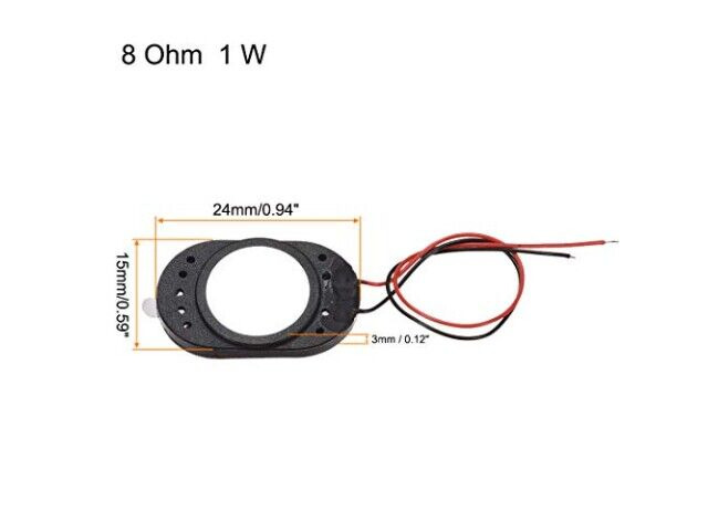 Specifikationer: Nominell effekt: 1W, Impedans: 8 Ohm, Kabellängd: 70mm, Högtalarehöjd: 3mm, Storlek: 15mmx24mm