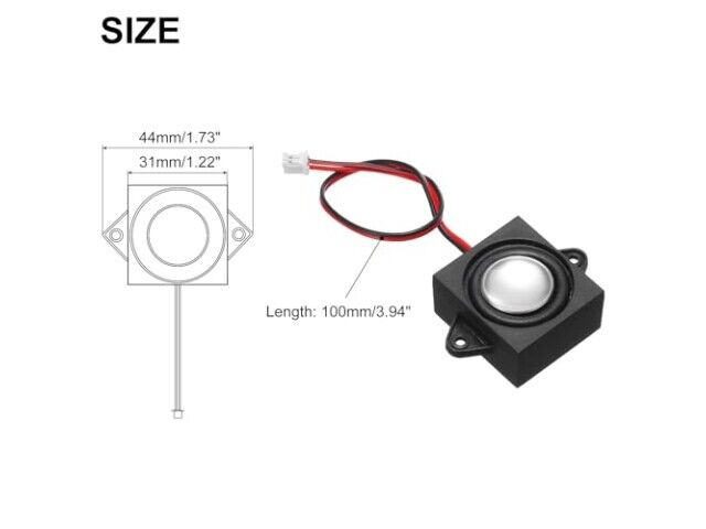 Specyfikacja: Moc znamionowa: 3W; Impedancja: 4 Ohm; Długość kabla: 100 mm / 3,94 cala; Długość x Szerokość x Wysokość: 44 x 31 x 15 mm / 1,73 x 1,22 x 0,59 cala; Typ złącza: złącze terminalowe JST-PH2.0mm-2 pin
