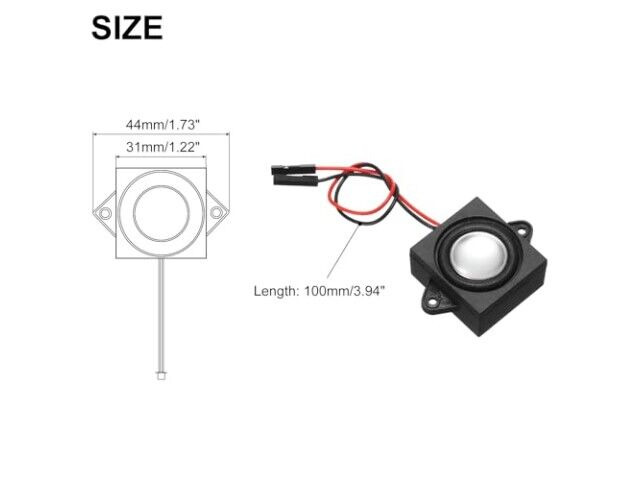 Specyfikacja: Moc znamionowa: 3W; Impedancja: 4 Ohm; Długość kabla: 100 mm / 3,94 cala; Długość x Szerokość x Wysokość: 44 x 31 x 15 mm / 1,73 x 1,22 x 0,59 cala; Typ interfejsu: złącze terminalowe 2-pin 2.0