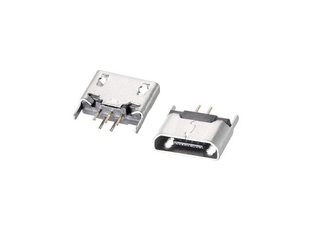 Specyfikacje: Type: Micro USB Female; Pin Number: 5-Pin; Features: 180 Degree Pins; Rated Current: 1A; Voltage: 30V; Total Size: 7.5mm x 7mm x 2.6mm; Material: Plastic, Metal; Color: Silver Tone, Black