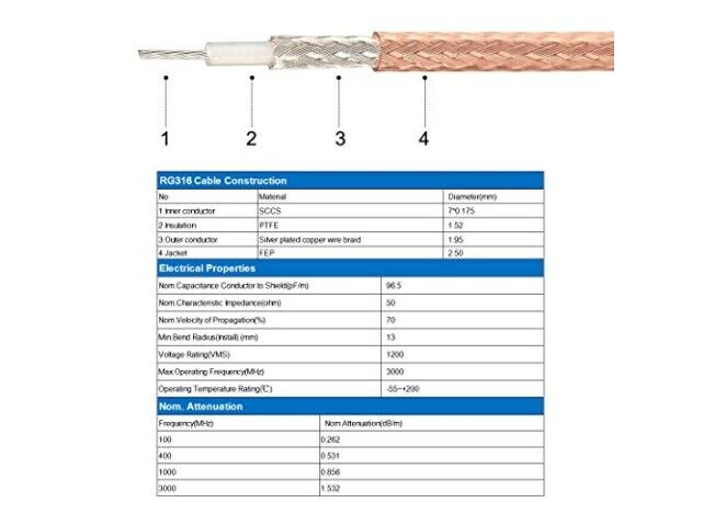 Kabel wykorzystuje konstrukcję koaksjalną RG316, która zapewnia doskonałą ekranowanie i niskie straty sygnału. Jest klasyfikowany jako 50 ohm, co gwarantuje kompatybilność z standardowymi systemami RF i urządzeniami. Złączka jest niklowana dla odporności na korozję, a kontakty miedziane pokryte złotem zapewniają optymalną przewodność i trwałą wydajność.