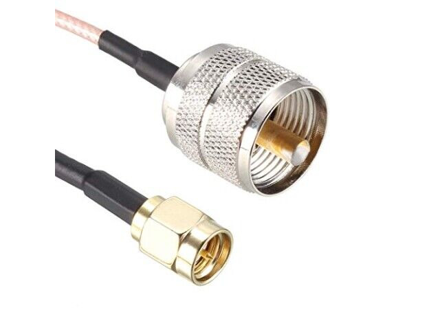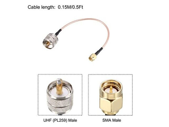 Specifikationer: 0,5 fot längd, 50 ohms motstånd, dubbelskottsystem, SMA Hannen till UHF PL-259 Hannen