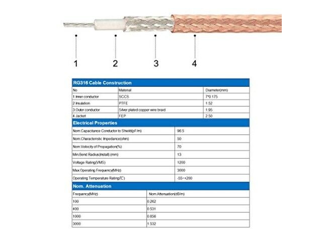 RG316 koaxialkabeln är byggd med en PTFE-skalning som ger utmärkt motstånd mot höga temperaturer och korrosion. Detta säkerställer att kablen förblir hållbar och funktionell även i utmanande miljöer. Anslutningarna är nickelplackerade med guldpläterade kontakter, vilket förbättrar ledningsförmågan och minskar signalförlust över tid.