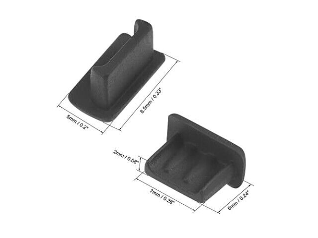 Specifikationer: Passar för minsta USB-port; Material: Silikon; Färg: Svart & Klar; Total storlek: 8,5 x 5 x 6 mm / 0,33 x 0,2 x 0,24 tum (L B H); Utsida installera storlek: 7 x 2 mm / 0,28 x 0,08 tum (L B)