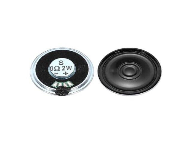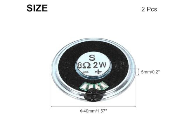 Specyfikacja: Typ: Głośnik z wewnętrznym mikromagnetem, okrągły; Interfejs: Brak interfejsu; Moc znamionowa: 2W; Impedancja: 8 Ohm; Średnica zewnętrzna: 40 mm / 1,57 cala; Wysokość: 5 mm / 0,2 cala