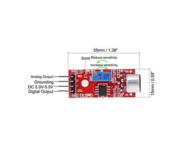 Modulens PCB är liten, med måtten 35 x 15mm, och har monteringshål för enkel installation på brödplåtar eller anpassade höljen. Den har också LED-indikatorer som visar status och utgångssignaler, vilket kan vara till hjälp för felsökning och övervakning av prestanda. Känslighetsjusteringspotiometern låter användare anpassa hur responsiv sensorn är för olika ljudnivåer, vilket gör den anpassningsbar för olika miljöer och användningsfall.