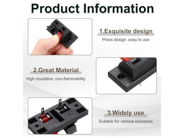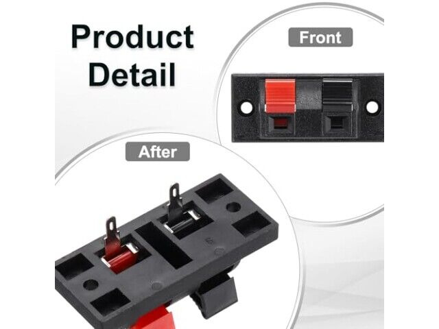 Jest to blok zaciskowy głośnikowy z zatrzaskami sprężynowymi zaprojektowany do bezpiecznych i łatwych połączeń przewodów. Jest często stosowany w systemach audio wysokiej klasy, budowanych na zamówienie zestawach głośnikowych oraz w różnych zastosowaniach inżynierii elektronicznej. Urządzenie umożliwia szybkie i niezawodne połączenia bez konieczności lutowania, co czyni je idealnym rozwiązaniem zarówno do użytku domowego, jak i przemysłowego. Jego sprężynowy mechanizm zapewnia pewne trzymanie przewodów, zmniejszając ryzyko luźnych połączeń lub problemów elektrycznych.