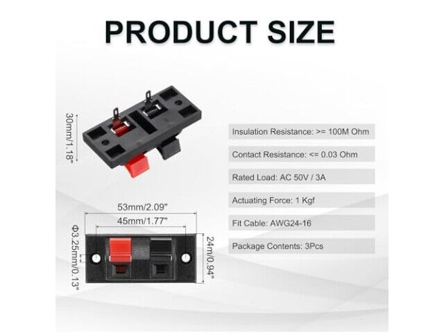 Specyfikacje: Rated Load: AC 50V / 3A; Actuating Force: 1 Kgf; Fit Cable: AWG24-16; Color Polarity Coding: Red/Black; Size: 53mm x 24mm x 30mm/2.09" x 0.94" x 1.18"; Mounting Hole Distance: 45mm/1.77"; Mounting Hole Size:3.25mm/0.13"; Material: Plastic,Copper