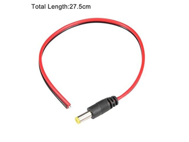 Specyfikacje: Connector Type: DC Power Jack Male Connector (2.1mmx5.5 mm); Total length: 27.5cm / 10.8 inch; Wire OD: 4.5mm(Two wires); Voltage: 12V; Operating Temperature: -50C to + 65C; Joint polarity: Red(Positive) / Black(Negative); Wire material: pure copper core ( oxygen free copper / non recovery copper); Joint material: arc quenched pure copper + galvanized (non iron head); Plastic material: new flame retardant PVC plastic