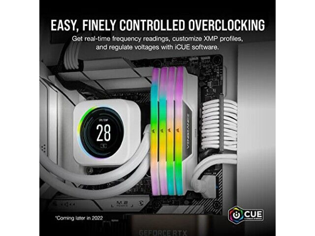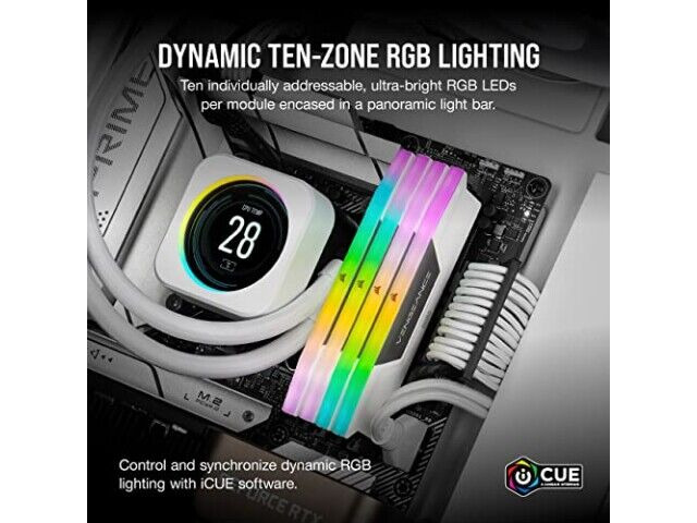 Die Speichermodule verfügen über dynamische RGB-Beleuchtung mit zehn Zonen, sodass Benutzer das Aussehen ihres PCs mit lebendigen, individuell ansprechbaren LEDs anpassen können. Diese Beleuchtung wird über die CORSAIR iCUE-Software gesteuert, die auch die Echtzeitüberwachung der Frequenz und die interne Spannungsregelung ermöglicht. Die RGB-Beleuchtung ist aus jedem Winkel sichtbar dank des Panorama-Lichtleisten-Designs, was sie zu einem herausragenden Merkmal für alle macht, die das Aussehen ihres Systems personalisieren möchten.