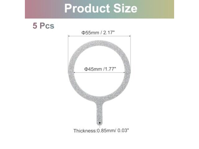 Specyfikacje: 5Pcs Magnetic Metal Ring; 1 Pcs Alignment Guide; Size: 55 x 45 x 0.85mm / 2.17 x 1.77 x 0.03inch(OD ID T)